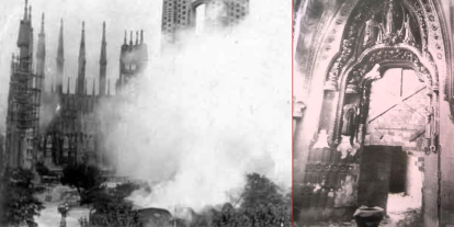 A la izquierda la Sagrada Familia el 20 de julio de 1936; a la derecha el portal del Rosario destrozado.