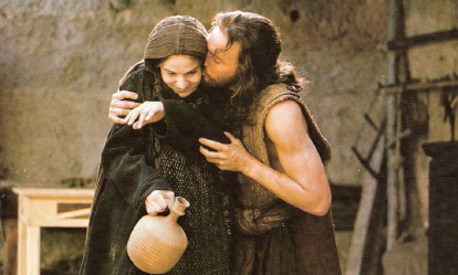 Fotograma de La Pasión de Cristo, en la que Jesús se muestra cariñoso con su madre antes de iniciar su vida pública