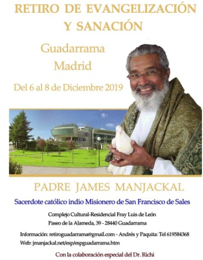 El padre Manjackal predica un Retiro de Evangelización y Sanación en España en diciembre de 2019, del viernes 6 por la tarde al domingo 8 de diciembre, en el centro de los agustinos (Complejo Cultural-Residencial Fray Luis de León en Guadarrama; Paseo de la Alameda, 39, Guadarrama, Madrid). Más información en el email retiroguadarrama@gmail.com y en la web en JManjackal.net.
