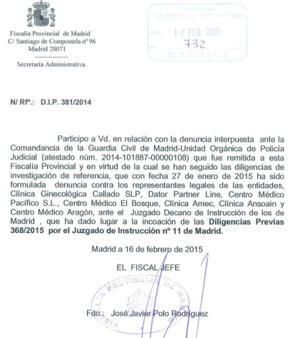 Concretamente, la Fiscalía Provincial de Madrid comunica, en un escrito de 16 de febrero ya difundido por agencia Europa Press, que el juez ha incoado diligencias previas tras la denuncia interpuesta por la Fiscalía contra los representantes legales de la Clínica Ginecológica Callao SLP, Dator Partner Line, Centro Médico Pacífico S.L., Centro Médico El Bosque, Clínica Amec, Clínica Ansoain y el Centro Médico Aragón.