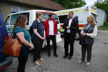 Caritas Ucrania en Ivano-Frankivst enseña sus instalaciones a delegados de Caritas de otros países. Se observa una ambulancia polaca y otra italiana donada por la Orden de Malta.
