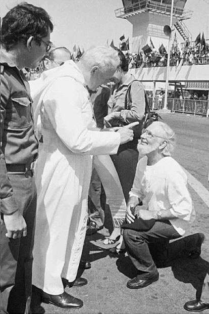 San Juan Pablo II regaña a Ernesto Cardenal delante de Daniel Ortega, el líder sandinista nicaragüense: un sacerdote no puede militar en una formación política ni hacer política de partidos
