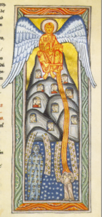 Esta miniatura con la figura luminosa, la montaña y el campo azul de abajo lleno de estrellas casi resume el contenido de los tres libros que componen el Scivias. El Ser tan extraordinariamente luminoso que señorea desde lo alto con sus alas extendidas se corresponde con el Primer Libro del Scivias en el que se relata la prehistoria de la salvación: el Creador y el hombre necesitado de redención de la cual, afortunadamente, se encarga Dios misericordioso.