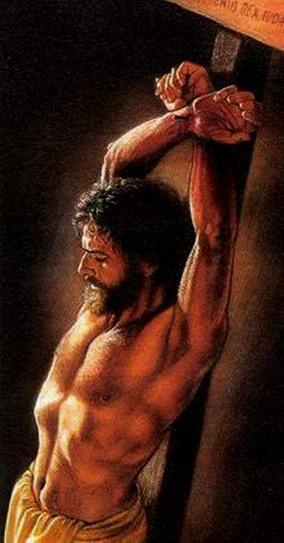 (1) Cristo de cabello corto con brazos extendidos en un madero de los Testigos de Jehová pues no creen que murió en una cruz;