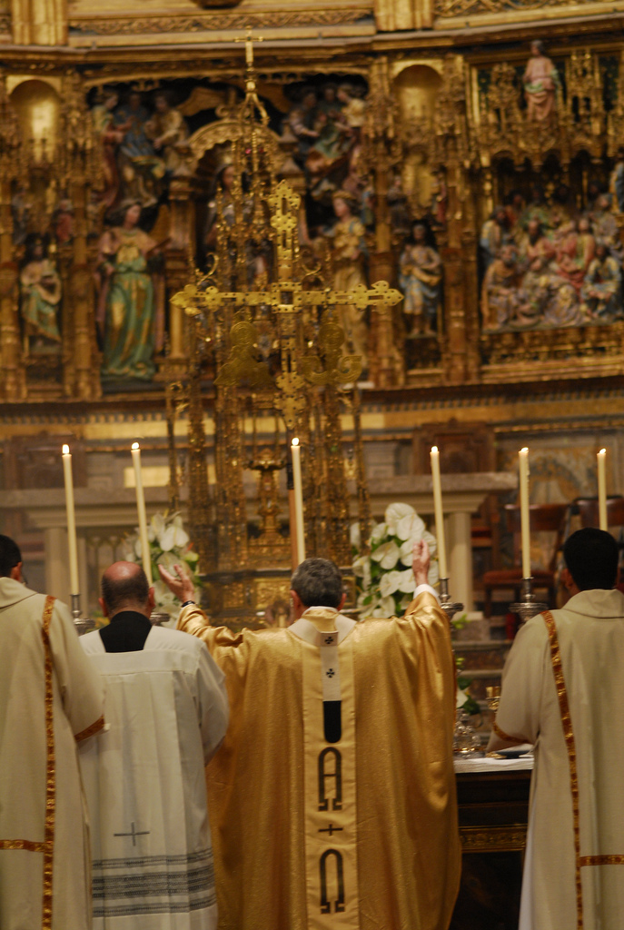 El Obispo deja la patena sobre el altar y hace inclinación profunda. Toma el cáliz y prosigue: