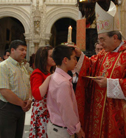 -Oración de los fieles. "Si volvemos ahora al conjunto de nuestra meditación, me parece que la estructura en tres partes de la confirmación es también un símbolo de nuestra vida de cristianos. En la sucesión de las promesas, de la plegaria, después de la signación, los actos son sucesivamente nosotros mismos, después Cristo, por último la Iglesia y el Espíritu Santo. Podemos describir también estas tres partes como palabra, respuesta y acción. Y estos tres elementos -nosotros, Cristo, la Iglesia- se relacionan en la acción. Esta estructura del sacramento reproduce como en un espejo el ritmo de la vida: al comienzo, el acto se pone sobre la invitación a actuar nosotros mismos. Ser cristiano aparece como una decisión, como una llamada hecha a nuestro valor y a nuestra capacidad de renuncia y decisión. Esto parece penoso, y la vida de los otros parece más confortable. Pero cuanto más entramos en el "sí" de las promesas del bautismo y de la confirmación, tanto más experimentamos que somos llevados por la Iglesia entera. Aquello que tenemos, hacemos y podemos nosotros mismos, comienza a deshacerse. Es esto lo que comienza a mostrar el fruto de nuestra respuesta. Allí donde, para el hombre que no conoce a Dios, la vida se convierte en una cáscara vacía, que a uno le gustaría mejor lanzar, es ahí donde se muestra cada vez más que es verdad que no estamos solos. E incluso cuando la oscuridad se hace poco a poco, incluso allí el camino conduce a este Amor que nos tiene y que nos lleva en brazos allí donde ningún hombre podría llevarnos. La fe es el fundamento sólido para la casa de nuestra vida; se mantiene firme incluso en un futuro que nadie puede prever (cf. Mt 7,24-27). Así, la confirmación es una promesa que llega hasta la eternidad. Pero es sobre todo una llamada a nuestro valor, a nuestra audacia. Una llamada a atrevernos, con Cristo, a fundamentar nuestra vida sobre una fe que se sostiene libre para Él y que lo espera, incluso si otros lo encuentran ridículo o desfasado. El camino conduce a la luz. Asumamos el riesgo. Digamos "sí". Esta hora en que recibimos el sacramento nos da el valor. "¡Elige la vida!". Amén" (RATZINGER, J., "Choisis la vie!", en: Communio, ed. francesa, VII (1982), n. 5, p. 69).