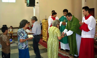 El desarrollo es más sencillo y solemne a la vez: -Suena el órgano o se entona un canto de ofrendas -Todos en procesión caminan al altar llevando las ofrendas -Estas ofrendas serán la materia del sacrificio: todas las patenas o copones necesarios, ya sean dos, seis, diez… y el agua y vino (o bienes para la iglesia, como una casulla, un nuevo mantel, etc., o para los pobres) -Al pie del altar o en la sede las recoge el sacerdote que preside -Sobre el altar sólo se coloca el pan y el vino; las demás ofrendas siempre en otro lugar, jamás sobre el altar.