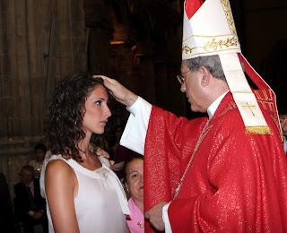 Entonces, terminados los ritos bautismales, comienza la oración universal, normalmente dirigida por un diácono (ese es oficio propio del diácono) proponiendo las intenciones y todos los fieles oran a cada intención. Es oficio sacerdotal por el bautismo y los ya neófitos “participan por primera vez”[2], no en el sentido de que lean ellos cada intención, sino orando juntos como cristianos sacerdotes a aquello que el diácono propone. Su participación, como la de los demás fieles, es orar e interceder, rezando o cantando la respuesta de cada petición. Finalmente, participan aportando el pan y el vino que presentan al Obispo como materia para el sacrificio eucarístico, y sólo pan y vino, todo el pan y vino necesarios para la comunión, excluyendo –como sabemos- esa innovación extraña de ofrendas simbólicas con moniciones explicativas. “Mientras se entona el canto para la presentación de dones, es oportuno que algunos neófitos lleven al altar el pan, el vino y el agua para la celebración de la Eucaristía” (CE 428; RICA 232). “Es conveniente que el pan y el vino sean presentados por los neófitos, o, si son niños, por sus padres o padrinos” (CE 370). Finalmente, ese día, “es conveniente que los neófitos reciban la sagrada Comunión bajo las dos especies” (ibíd.), ya que esa es la plena participación[3]. b) Confirmación En el sacramento de la Confirmación, el modo de participar de los confirmandos es ser confirmados, recibir la Crismación de manos del Obispo. Parece evidente, y sin embargo, la praxis pastoral-litúrgica no lo ve tan evidente. Quien va a ser confirmado tiene su modo propio, especialísimo y único de participar: son llamados y presentados al Obispo después del evangelio y antes de la homilía (CE 461), y tras la homilía renuevan los compromisos bautismales (CE 463) interrogados por el Obispo; oran intensamente mientras el Obispo impone las manos al recitar la oración “Dios todopoderoso” pidiendo el Espíritu Santo, y participan recibiendo la crismación en la frente. Ese modo de participación es único y excelente: reciben de Dios, oran a Dios, son sellados por Dios.