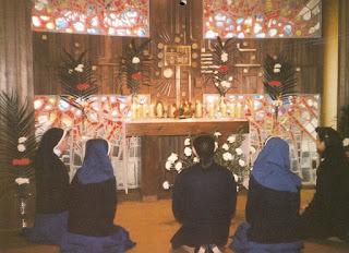 Ese quitar las capas de sí alcanza su dimensión eclesial en el sacramento de la penitencia: ahí me dejo configurar con Cristo que tomó sobre sí mis pecados y los ha confesado el primero a su Padre, ahí recibo con el perdón la gracia de vivir en primera persona lo que yo había hecho creyendo ilusoriamente construir mi personalidad. Y por la eucaristía, esta gracia se dona como eclesial: el Yo puede -e incluso debe- afirmarse como el Yo de la Iglesia, como lo hacemos al proclamar el Credo, como los mártires lo hacen dando su vida; nuestra obra, unida a la de Cristo, se pone a disposición de todos nuestros hermanos en vistas a la comunión de todos. Es así como el camino común de la oración desemboca en el prójimo también directamente como el sí de María dicho al Ángel desembocó en la visita a Isabel. De parte a parte, la oración verdadera es encarnada porque ella está contenida en el misterio de la Encarnación. Tampoco podría ser extraña a la Virgen María, la Madre de Dios. Lo mismo que el misterio de Dios ha venido hasta nosotros por su fiat, por lo mismo no podemos conocerlo si no es gracias a su fiat, al añadir nuestro "sí" al de la Esclava del Señor y haciendo subir por medio de ella nuestro reconocimiento y nuestra súplica. Coloquio con Dios, la oración se dilata entonces en triple coloquio con la Madre, el Hijo y el Padre: la Madre intercediendo ante el Hijo y el Hijo ante el Padre. Con una gran flexibilidad en su aplicación, esta oración, a la vez trinitaria y eclesial, parece constitutiva de toda oración. Así centrada en el misterio de la Encarnación y a un tiempo también encarnada, la oración se hace en el cuerpo. Porque el Hijo de Dios tomó sobre él nuestro cuerpo mortal y lo transfiguró por su resurrección, todo el cuerpo pertenece a la oración. Ninguna actitud está, para la oración individual, prescrita (esto es lo opuesto al zen). Puedo orar sentado, tendido, de pie, caminando. La única regla es permanecer en la actitud corporal en la que encuentro fruto. Puedo también ritmar mi invocación o mi oración con mi respiración -como en el hesicasmo. Pero no se trata de una técnica buscando obtener un efecto, sino de poner mi cuerpo -aquí por la respiración- a disposición de la gracia. Nada de la realidad corporal es ajena a la glorificación de Dios. La gracia divina se sirve del cuerpo entero y expresa en él el designio divino. Lo que se me pide es no ponerle obstáculo alguno. Es el caso de la enfermedad. No hace falta que sea una enfermedad larga o penosa para que no se pueda "más que" dejar a Dios disponer de su cuerpo" (CHANTRAINE, G., Le milieu ecclésial, en: Communio, ed. francesa, X,4, juillet-août, 1985, pp. 24-26).