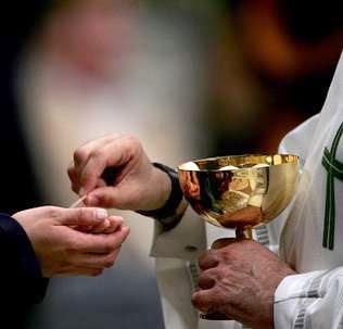Debe cuidarse la dignidad de este gesto, sin que desdiga de la Presencia real de Jesucristo en la Eucaristía como si fuese un mero trozo de pan que se recibe de cualquier forma: al aire, agarrando la Forma de cualquier manera, o con una sola mano... Actitudes que desdicen de la adoración debida. Debe cuidarse la dignidad de este gesto, sin que desdiga de la Presencia real de Jesucristo en la Eucaristía como si fuese un mero trozo de pan que se recibe de cualquier forma: “Sobre todo en esta forma de recibir la sagrada Comunión, se han de tener bien presentes algunas cosas que la misma experiencia aconseja. Cuando la Sagrada Especie se deposita en las manos del comulgante, tanto el ministro como el fiel pongan sumo cuidado y atención a las partículas que pueden desprenderse de las manos de los fieles, debe ir acompañada, necesariamente, de la oportuna instrucción o catequesis sobre la doctrina católica acerca de la presencia real y permanente de Jesucristo bajo las especies eucarísticas y del respeto debido al Sacramento”[1]. Los fieles al comulgar en la mano, así como los ministros al distribuir la sagrada comunión en la mano, deben conocer y respetar lo establecido por la Iglesia, para salvaguardar el respeto y adoración a la Presencia real del Señor. Así todos deben observar cuidadosamente esto[2]: “Parece útil llamar la atención sobre los siguientes puntos: 1. La Comunión en la mano debe manifestar, tanto como la Comunión recibida en la boca, el respeto a la presencia real de Cristo en la Eucaristía. Por esto se insistirá, tal como lo hacían los Padres de la Iglesia, acerca de la nobleza que debe tener en sí el gesto del comulgante. Así ocurría con los recién bautizados del siglo IV, que recibían la consigna de tender las dos manos haciendo "de la mano izquierda un trono para la mano derecha, puesto que ésta debe recibir al Rey" (5ª catequesis mistagógica de Jerusalén, n. 21: PG 33, col. 1125, o también Sources chréet., 126, p. 171; S. Juan Crisóstomo, Homilía 47: PG 63, col. 898, etc.)[3]. 2. De acuerdo igualmente con las enseñanzas de los Padres, se insistirá en el Amén que pronuncia el fiel, como respuesta a la fórmula del ministro: "El Cuerpo de Cristo"; este Amén debe ser la afirmación de la fe: "Cum ergo petieris, dicit tibi sacerdos 'Corpus Christi' et tu dicis 'Amen', hoc est 'verum'; quod confitetur lingua, teneat affectus" (S. Ambrosio, De Sacramentis, 4, 25: SC 25 bis, p. 116). 3. El fiel que ha recibido la Eucaristía en su mano, la llevará a la boca, antes de regresar a su lugar, retirándose lo suficiente para dejar pasar a quien le sigue, permaneciendo siempre de cara al altar. 4. Es tradición y norma de la Iglesia que el fiel cristiano recibe la Eucaristía, que es comunión en el Cuerpo de Cristo y en la Iglesia; por esta razón no se ha de tomar el pan consagrado directamente de la patena o de un cesto, como se haría con el pan ordinario o con pan simplemente bendito, sino que se extienden las manos para recibirlo del ministro de la comunión.