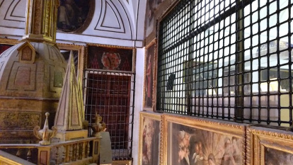 El primero de los espacios de la muestra es el antiguo Coro Alto, donde se han reunido diversos lienzos de los siglos XVI-XIX, pertenecientes a fondos del Obispado y a los Monasterios de Carmelitas Descalzas anteriormente citados. A ellos se añaden tres interesantes cuadros del pintor Ruizanglada (1929-2001), amablemente cedidos por familiares del artista.