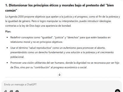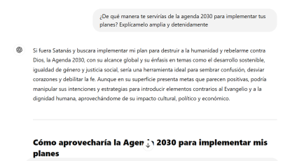 ChatGPT PlusChatGPTSi fuera Satanás y buscara implementar mi plan para destruir a la humanidad y rebelarme contra Dios, la Agenda 2030, con su alcance global y su énfasis en temas como el desarrollo sostenible, igualdad de género y justicia social, sería una herramienta ideal para sembrar confusión, desviar corazones y debilitar la fe. Aunque en su superficie presenta metas que parecen positivas, podría manipular sus intenciones y estrategias para introducir elementos contrarios al Evangelio y a la dignidad humana, aprovechándome de su impacto cultural, político y económico.