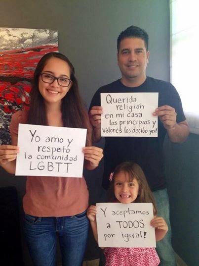 Hoy comparto un hecho real que viví hace unas pocas horas en las redes sociales. Esta foto apareció en el muro de Facebook de un amigo, seguido del siguiente comentario “Respetan y son felices y su vida no cambia en nada que, no sea ser superior, a la de tanto burro cerrado por estos lares ...” Quizás lo que más llame de la foto sea el cartel de la chica mayor “Yo amo y respeto la comunidad LGBTT”, pero creo más interesante centrarnos en lo que dice el hombre y la niña pequeña. Sólo deseo reseñar que el amor y el respeto, lo merecen las personas una a una, ya que todos somos hijos de Dios e imagen Suya. Amar a un colectivo resulta vago y puede hacernos pensar en que lo que se “ama” es lo que conforma el grupo (ideología), antes que las personas. Dejemos esto aquí y vayamos a lo más interesante.