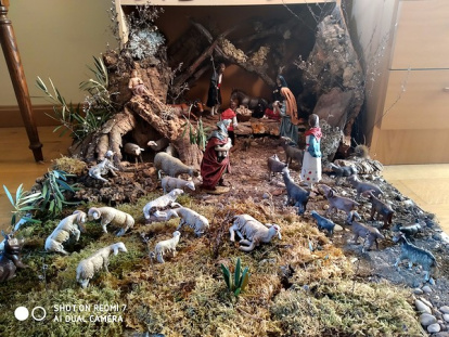 Desde que estoy en Calahorra ha cambiado la situación. Lo pongo en la habitación que tengo en el Carmen y lo dejo hasta la fiesta de la Presentación del Señor, el día 2 de febrero. En estos casi dos meses me acompaña el misterio de la Navidad en cada momento de estudio, lectura, conversaciones telefónicas, etc. y hasta en el descanso. Lo aprovecho mucho más y me ayuda a entrar en esa realidad del Nacimiento de Nuestro Señor y la adoración de los pastores. La renuncia, la pobreza, la desnudez, o por decirlo de otro modo, “las nadas” de San Juan de la Cruz las llevo a la oración teniendo esta escena delante. Me ayuda a meterme de lleno y sin prisas en la Humanidad sacratísima del Hijo de Dios, como dice Santa Teresa de Jesús, y a ver cómo tengo que acercarme a Él. Es muy fácil: como los pastores de Belén, es decir, llevándole algún presente, adorándole como verdadero Dios y reconociendo en ese Niño al Supremo Pastor de todos los hombres. Así rezo cada día. Pero cada jornada es distinta porque llevo intenciones, dones y agradecimientos diferentes según lo que haya pasado en el día o lo que voy a vivir al día siguiente o si alguna persona viene a hablar o tengo algún asunto de importancia y situaciones similares. Me dejo llenar y me paseo por el camino de tierra y piedras entre las cabras con su pastora o por el prado donde pastan las ovejas, pero sin dejar de mirar al fondo, a la cueva, al Niño.
