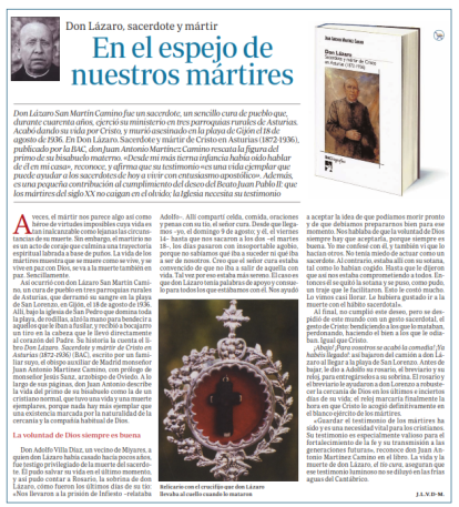 Don Lázaro San Martín Camino fue un sacerdote, un sencillo cura de pueblo que, durante cuarenta años, ejerció su ministerio en tres parroquias rurales de Asturias. Acabó dando su vida por Cristo, y murió asesinado en la playa de Gijón el 18 de agosto de 1936. En “Don Lázaro. Sacerdote y mártir de Cristo en Asturias (18721936)” (Madrid 2011), Monseñor Martínez Camino, Obispo auxiliar de la Archidiócesis de Madrid y Secretario de la Conferencia Episcopal Española, rescata la figura del primo de su bisabuelo materno. “Desde mi más tierna infancia había oído hablar de él en mi casa”, reconoce, y afirma que su testimonio “es una vida ejemplar que puede ayudar a los sacerdotes de hoy a vivir con entusiasmo apostólico”. Además, es una pequeña contribución al cumplimiento del deseo del Beato Juan Pablo II: que los mártires del siglo XX no caigan en el olvido; la Iglesia necesita su testimonio.