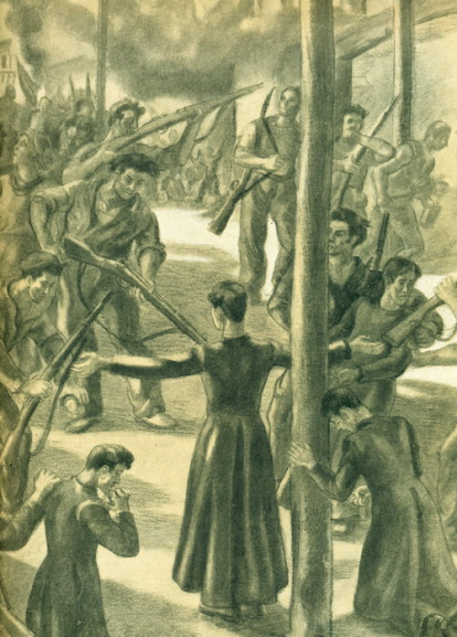 Y bien pudieran ser -sobre estas líneas- los reflejados por Joaquín Valverde en “Fusilamiento de seminaristas”. El dibujo aparece en el II volumen de Historia de la Cruzada española (pág. 219).