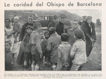 El Siervo de Dios Manuel Irurita Almandoz (en el centro de la fotografía) aparece sonriendo junto a unos niños en una visita pastoral a Mar Bella o Pekín, en el barrio barcelonés de Poblenou. Gracias a sus gestiones los pasionistas vinieron a Barcelona.