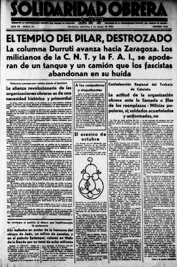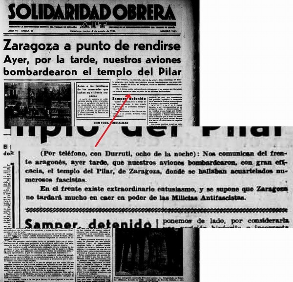 Para finalizar el post de hoy, recordamos lo que sucedió el 3 de agosto, hace 75 años, cuando se bombardeó el Pilar de Zaragoza. Así lo recogía la portada del periódico Solidaridad Obrera- AIT (Asociación Internacional de los Trabajadores): “Zaragoza a punto de rendirse. Ayer, por la tarde, nuestros aviones bombardearon el templo del Pilar”.