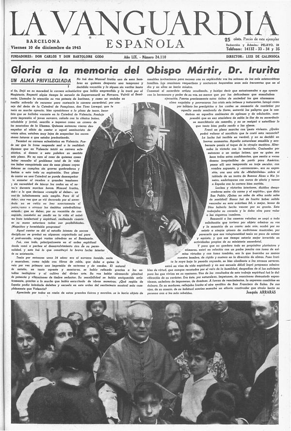 “Hoy celebra su fiesta onomástica nuestro bondadoso prelado doctor Manuel Irurita Almandoz, quien durante el breve tiempo que ejerce su pontificado en esta diócesis, ha sabido conquistar muchos afectos con su inagotable caridad y muchas almas con su palabra persuasiva y con el ejemplo de sus preclaras virtudes. Pastor prudente y comprensivo, a todos llegan los efluvios de su corazón nacido para el bien y para el amor que a todos nos iguala ante la grandeza infinita del Creador de todas las cosas. La divisa del doctor Irurita parece ser la de sumar voluntades para difundir cada vez más las enseñanzas de la Iglesia en todos los sectores de su rebaño. Y de ahí, que prodigue su presencia y sus consejos allí donde su sagrada persona puede procurar un consuelo, una esperanza o un bien, sobre todo entre los desheredados de la fortuna que, por serlo, más necesitan de quien, como el señor Obispo, es su pastor y su padre espiritual.