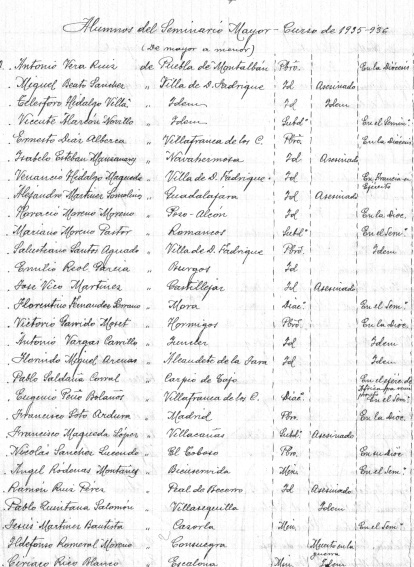 Heredada de los venerables sacerdotes que hicieron y custodiaron toda la documentación sobre el tema, se conserva una lista de los alumnos del Seminario Mayor de Toledo del curso 19351936. Allí se da cuenta de lo sucedido, escueta, pero claramente con cada uno de los seminaristas: nombre, de tal pueblo, (presbítero, diácono, subdiácono o en el curso en el que se encuentre…) muerto en la guerra, asesinado, en el seminario, en su pueblo, se retira, en el frente, nada se sabe, enfermo tuberculoso en Valdemoro… El número 40 de la lista lo ocupa nuestro protagonista con un escueto: “normal">asesinado”.