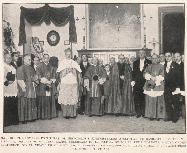 La primera foto de hoy fue publicada el 2 de febrero de 1928 en La Hormiga de Oro. En la explicación bajo la foto se nos dice que en "Madrid: el nuevo Obispo titular de Hierópolis y Administrador Apostólico de Barbastro, Doctor Mutiloa (x), después de su consagración celebrada en la iglesia de los PP. Redemptoristas, a cuya orden pertenece, con el Nuncio de Su Santidad, el Cardenal Segura, Obispos y personalidades que asistieron".