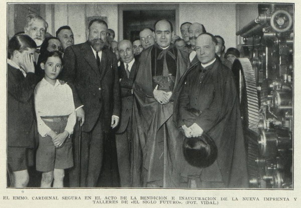 Esta otra, aparece publicada en La Hormiga de Oro el 17 de julio de 1928. El Emmo. Cardenal Segura en el acto de la bendición e inauguración de la nueva imprenta de El Siglo Futuro.