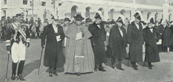 El 14 de febrero de 1929 La Hormiga de Oro da noticia del entierro de S.M. la reina Doña María Cristina. En Madrid: la presidencia del duelo, con los duques de Sotomayor y Miranda y el Cardenal Segura. La foto está tomada en el Palacio Real de Madrid (el llamado Palacio de Oriente).