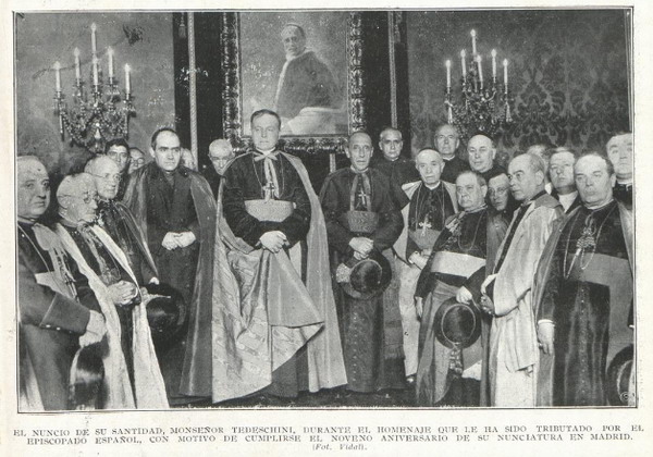 La Hormiga de Oro del 15 de mayo de 1930 titula en páginas interiores: Diversas notas gráficas de la actualidad en Madrid. En una de ellas leemos: El Nuncio de Su Santidad, Monseñor Tedeschini, durante el homenaje que le ha sido tributado por el episcopado español, con motivo de cumplirse el noveno aniversario de su Nunciatura en Madrid. Detrás el cuadro del Papa reinante: Pío XI.