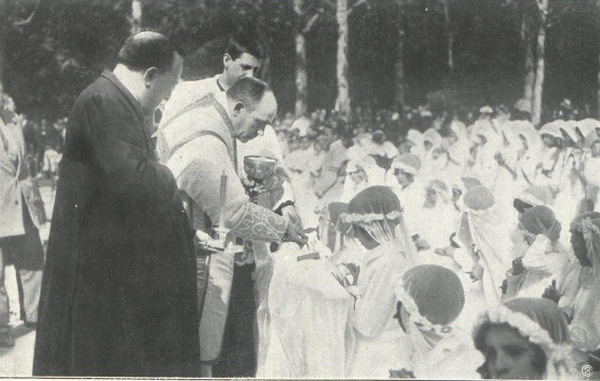 También como noticias de la capital de España, La Hormiga de Oro del 29 de mayo de 1930, recoge noticia de la Asamblea Nacional del Apostolado de la Oración: la comunión infantil. A pie de foto, puede leerse: Diferentes aspectos del retiro durante la solemne comunión infantil celebrada el último día de la Asamblea Nacional del Apostolado de la Oración. Seleccionamos esta en la que el Cardenal Pedro Segura aparece administrando la Comunión a un grupo de niñas.