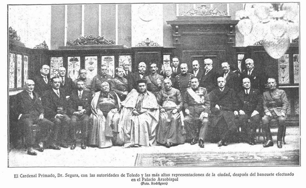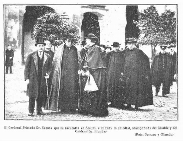 Con fecha del 26 de enero de 1928, leemos a pie de foto: La visita del Primado a Andalucía. Sevilla: El Cardenal Primado de España, Doctor Segura (con gafas de sol), acompañado del Cardenal Ilundain y del Alcalde de Sevilla, señor Díaz Molero, al salir de visitar la Catedral.