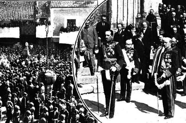 Bajo estas líneas: "Su Majestad el Rey con los ministros de Gracia y Justicia e Instrucción Pública y otras personalidades, presidiendo la procesión".