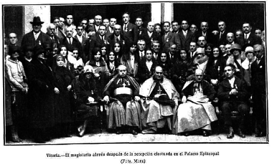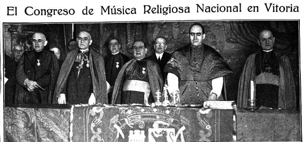 Estas otras fotografías fueron publicadas en Mundo Gráfico el 28 de noviembre de 1928. Pertenecen al Congreso de Música Religiosa Nacional que se celebró en Vitoria. Aparece el Cardenal Segura con el Arzobispo de Burgos y los Obispos de Vitoria y Palencia, presidiendo el acto de apertura del IV Congreso de Música Nacional Sagrada.