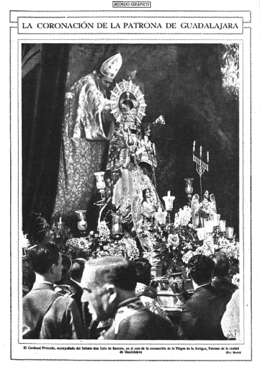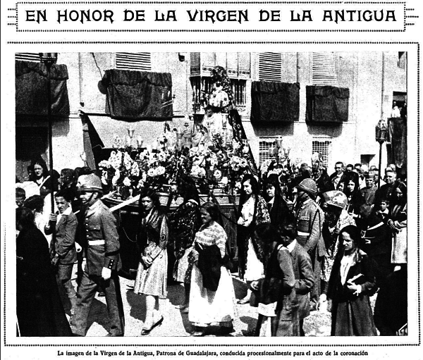 El 8 de octubre de 1930, Mundo Gráfico titula En honor de la Virgen de la Antigua. En Guadalajara se ha efectuado recientemente, y con extraordinaria solemnidad, el acto de la coronación de la Virgen de la Antigua, Patrona de la ciudad. La imagen fue llevada procesionalmente al sitio en que había de celebrarse el acto, en el que ofició el Cardenal Primado y fue presidido por los Infantes don Luis y don José de Baviera y el ministro del Trabajo.