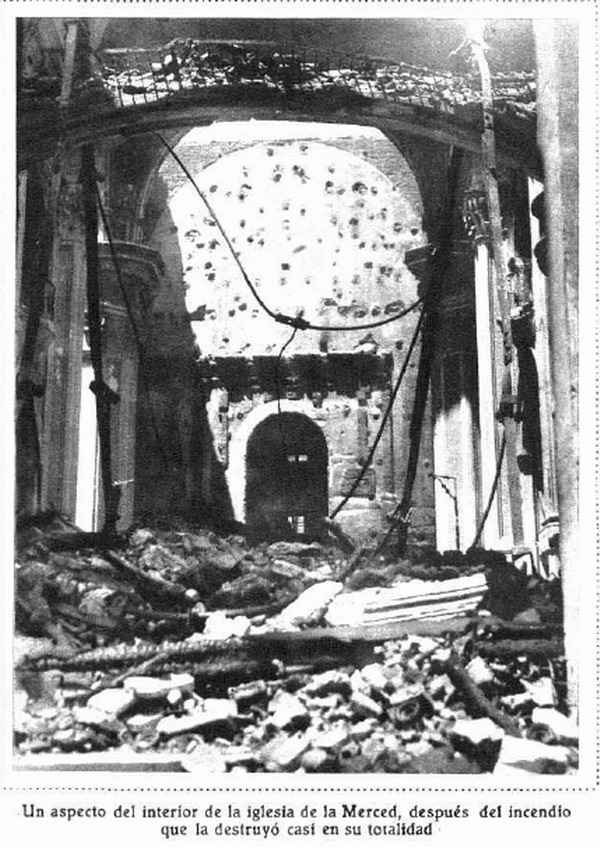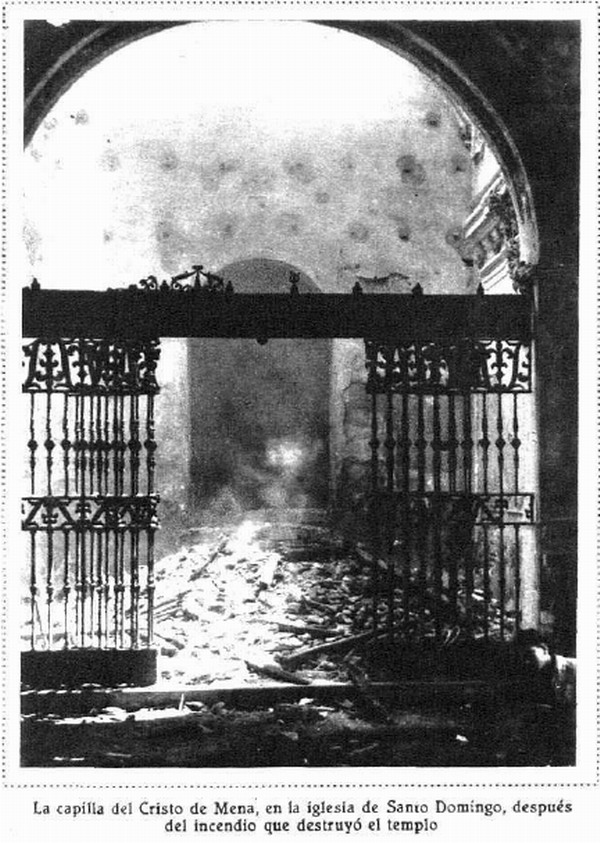 Mundo Gráfico del 20 de mayo de 1931 presentó, como venimos mostrando, casi un monográfico sobre los hechos acontecidos el lunes 11 de mayo de ese año. En la página doce figura el título: El incendio de los edificios religiosos en Málaga. Bajo estas líneas, el pie de foto puede leerse perfectamente, la capilla donde se custodiaba el famoso Cristo de Mena (de los Legionarios, que procesionan con una copia) que desapareció calcinado durante el incendio.