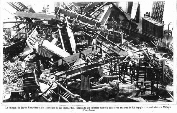 La tercera foto, bajo estas líneas, es del convento de las Madres Bernardas de la ciudad de Málaga. Lacerante es ver la imagen de un Resucitado entre el montón de sillas y bancos amontonados sacrílegamente.