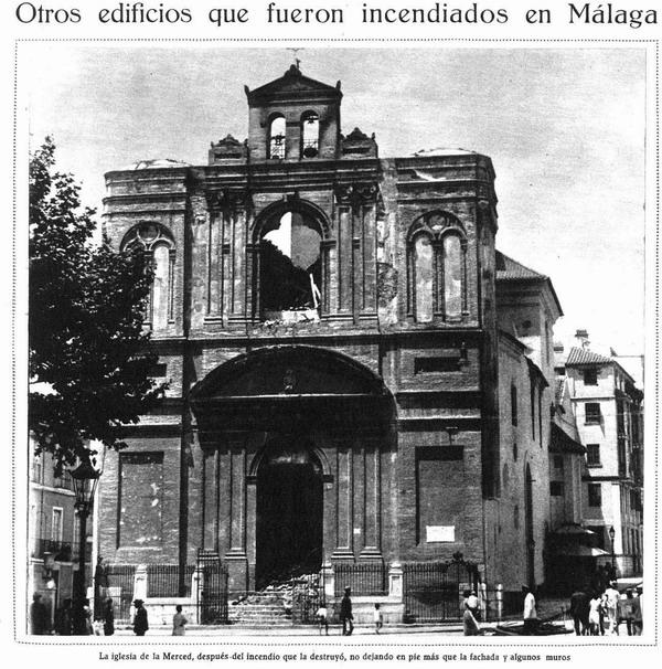 El 20 de mayo de 1931, en la página 13, Mundo Gráfico sigue mostrándonos el sacrílego destrozo ocasionado en la ciudad de Málaga. En primer lugar, la iglesia de la Merced. En la foto aparece la portada principal después del incendio que la destruyó, no dejando en pie más que la fachada y algunos muros.