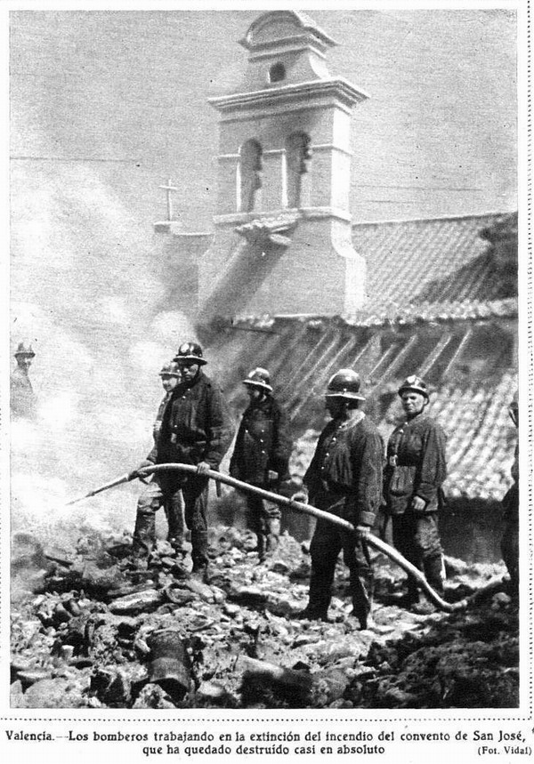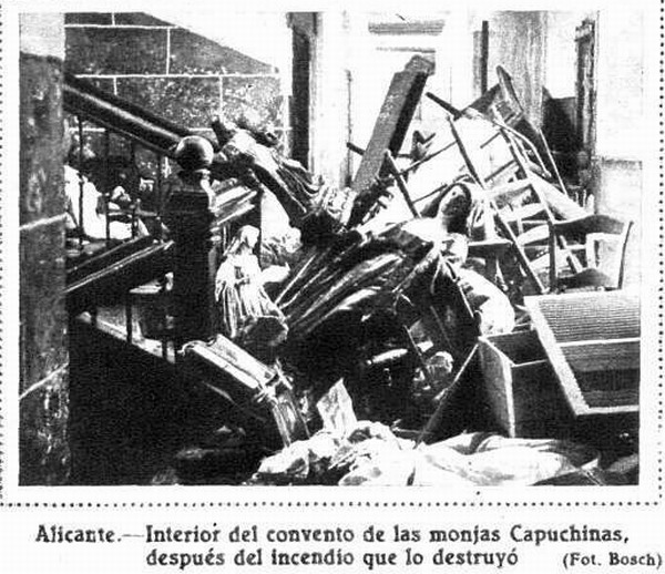 La página 26 del ejemplar del 20 de mayo de 1931 de Mundo Gráfico titula Destrozos causados por los incendios en las iglesias de provincias. La primera foto es esta espectacular talla de la Purísima, obra del admirable Salzillo, que quedó destruida en el incendio del convento de los padres franciscanos de Murcia.