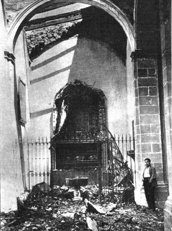 En cuanto a las fotos del pueblo de Córdoba se refiere a incendio "casual". Villa del Río (Córdoba).- Un aspecto del baptisterio de la iglesia parroquial, que ha sido totalmente destruida a consecuencia de un incendio que fue, según casi todos los informes, casual.