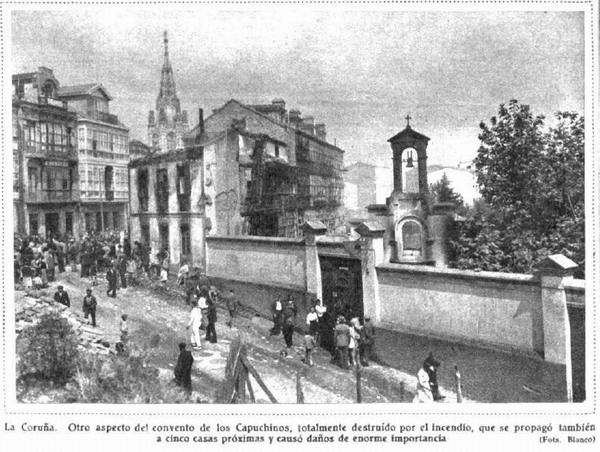 Bajo estas líneas: La Coruña. Otro aspecto del convento de los Capuchinos, totalmente destruido por el incendio, que se propagó a cinco casas próximas y causó daños de enorme importancia.
