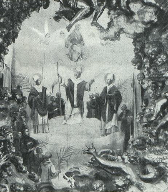 Los Hermanos Francisco José y Pedro Luis de la Rochefoucauld, Juan Mª Du Lau, Obispos, y algunos de los restantes ciento ochenta y ocho mártires de septiembre en la gloria de la Cátedra de San Pedro (en la primera foto, sobre estas líneas). El martirio de muchos de los sacerdotes en la cárcel de San Fermín. Estandarte del Pilar de Santa Verónica (en la segunda foto, sobre estas líneas).