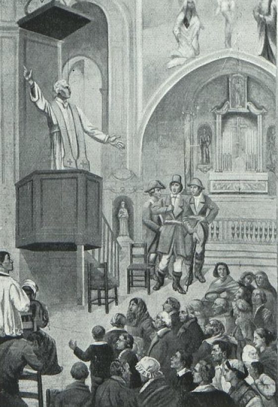 Sobre estas líneas: El párroco de Louroux (Angers), Noel Pinot, en presencia de la comisión revolucionaria nacional declara desde el púlpito a sus feligreses que no quiere prestar juramento a la Constitución Civil del Clero. Estandarte del Pilar de Santa Verónica.
