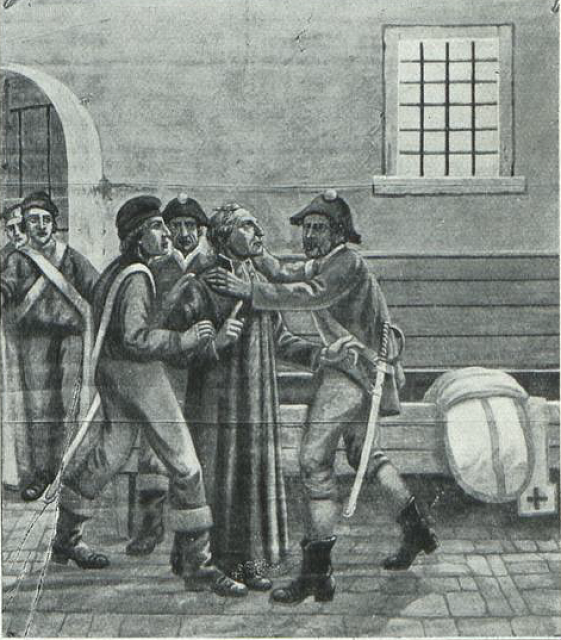 La última imagen, sobre estas líneas: El párroco Noel Pinot es detenido en la casa en que se había refugiado; llevaba consigo los ornamentos sacerdotales de celebrar misa, y revestido de ellos, subió al cadalso. Estandarte del pórtico de la Basílica.