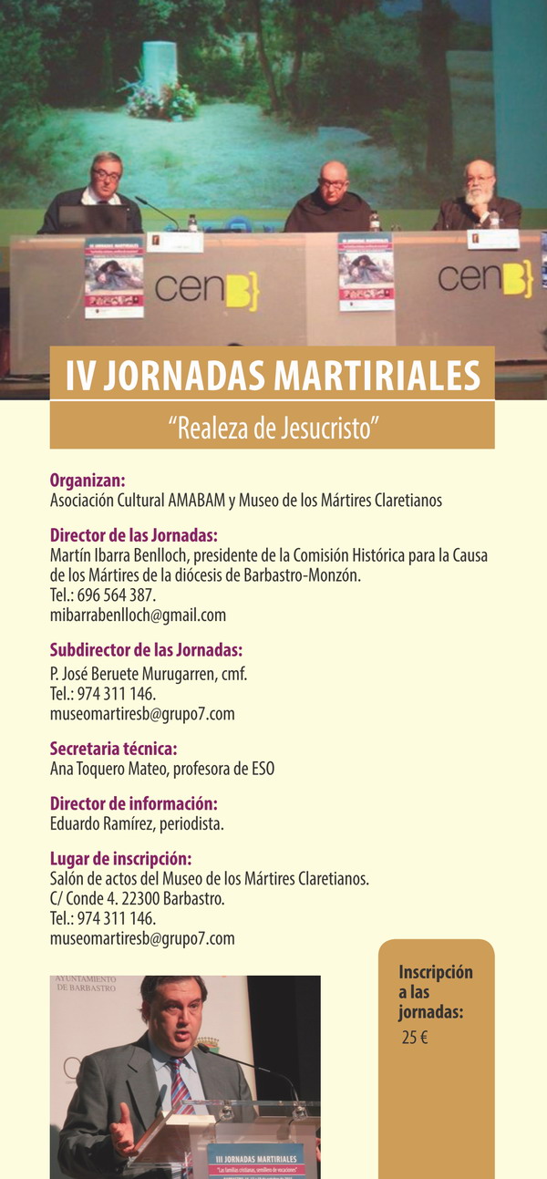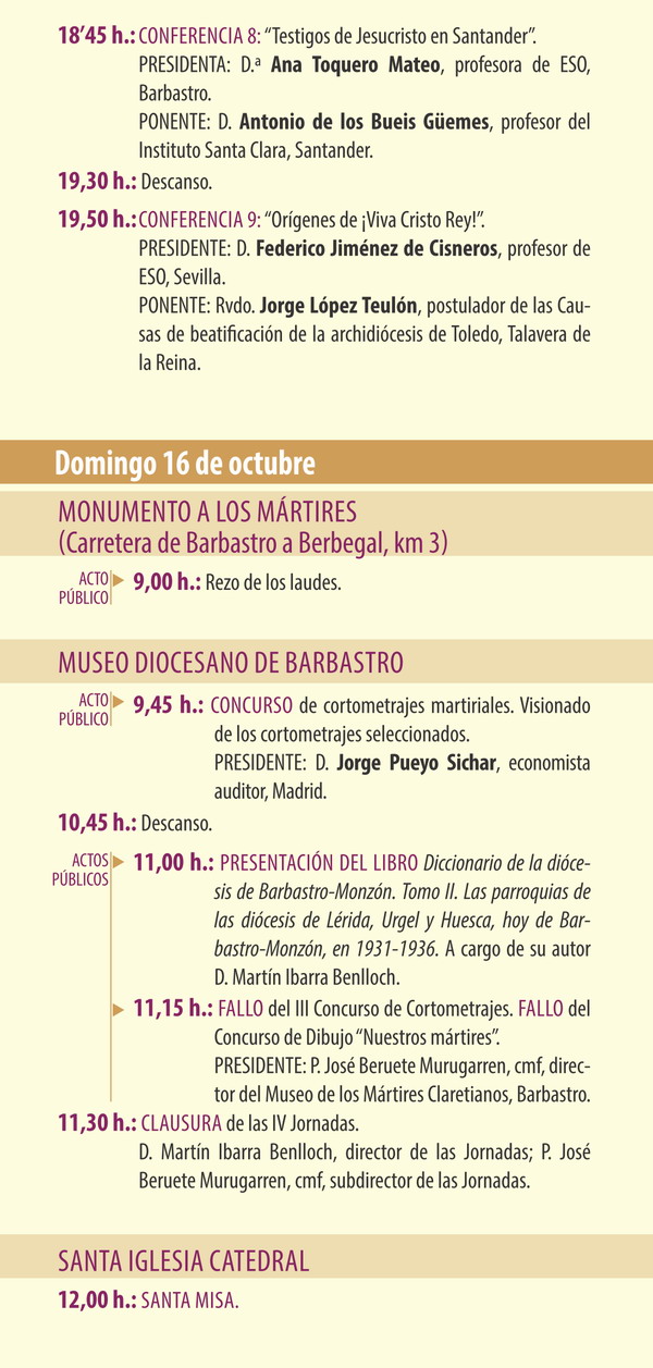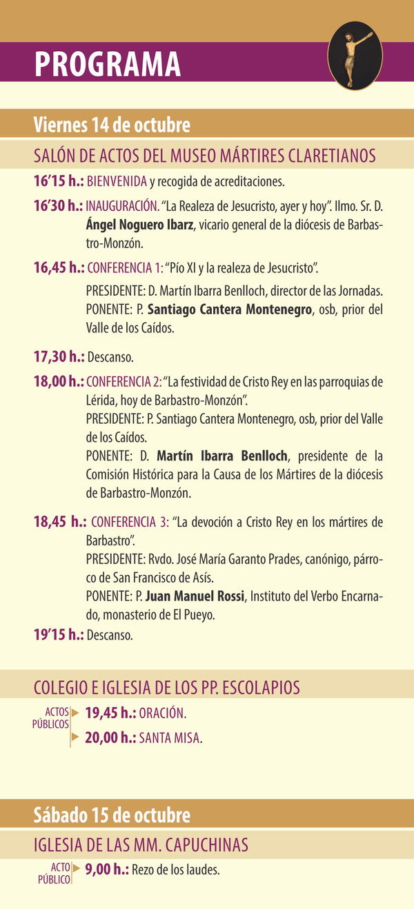 Victor in vínculis Jorge López Teulón 14, 15 y 16 de octubre, en Barbastro Facebook Twitter Whatsapp Whatsapp Telegram Copiar enlace Creado: 27.09.2016 | 00:00 Actualizado: 27.09.2016 | 00:00 En: Mártires Lo último Con Jesús, cada uno puede ser luz, dice el Papa; recuerda 60 años de una gran fecha ecuménica Alfonso Ussía: ironía, libertad y la audacia de una infancia feliz León XIV, en el concierto de los pobres, con Michael Bublé, Serena Autieri y Marco Frisina Misa del 8 de diciembre, solemnidad de la Inmaculada Concepción: vídeo, lecturas y homilía La Luna que ilumina la noche