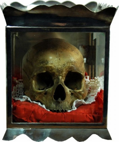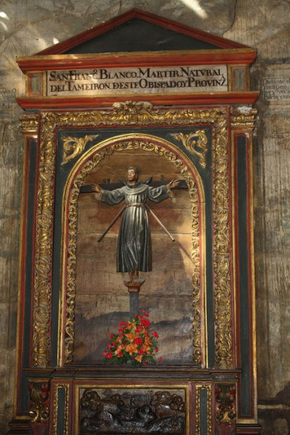 Retablo cerámico con san Francisco Blanco, en el Convento de San Francisco (Plazuela de San Francisco) de Lima, Perú. Bajo estas líneas, cráneo de San Francisco Blanco venerado en Outarelo, O Barco de Valdeorras.