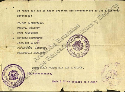 El Agente que suscribe tiene el honor de poner en conocimiento de V.I. que de las gestiones practicadas para localizar a los individuos que el 18 de octubre de 1936, detuvieron, en el piso de los Sres. de Irache, sito en el interior centro derecha del inmueble número 19 de la calle de Castelló, a las monjas llamadas Isabel Valenciano, Fermina Saldías, Adelaida Domínguez, Concepción Aguaros, Crescencia Manzanar, Rosa Domínguez y Rosario Domínguez, estas dos últimas sobrinas de dichos Sres. de Irache, resulta: