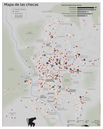 El equipo de investigación dirigido por Alfonso Bullón de Mendoza, catedrático de Historia en la Universidad CEU San Pablo, y compuesto por los historiadores Francisco Marhuenda, Sara Izquierdo Álvarez, Ángel David Martín Rubio, y Jaime Escolar García, ha llevado a cabo un estudio tan esencial como escalofriante de la represión revolucionaria en Madrid durante la Guerra Civil. El equipo ha localizado y cartografiado las 345 checas madrileñas –hallando 120 que no estaban inventariadas en la «Causa General» que se hizo en la posguerra–, a las que suman 23 prisiones oficiales y diez comisarías. A esto han añadido dos bases datos –de víctimas y chequistas–, que dan un panorama muy completo del terror que se tuvo que vivir en la ciudad desde 1936.