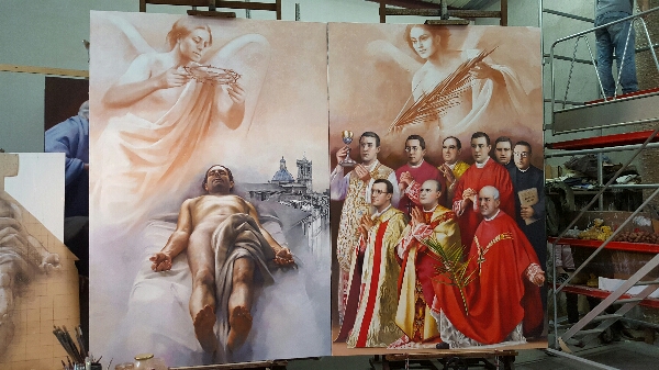 Mosén Badenes aparece en esta foto haciendo de "modelo" de uno de los sacerdotes mártires para el conjunto de la obra.
