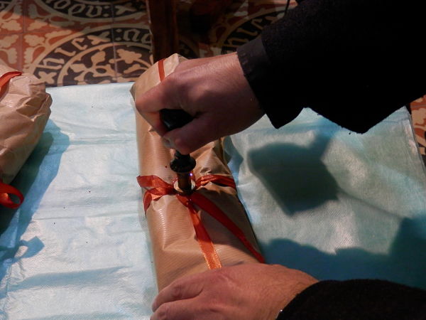 Lacrando el paquete con las reliquias entregadas al Seminario Menor. Debajo las firmas del acta.