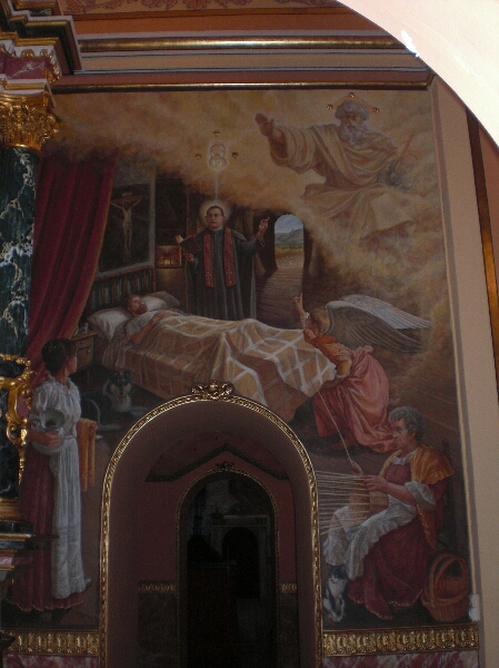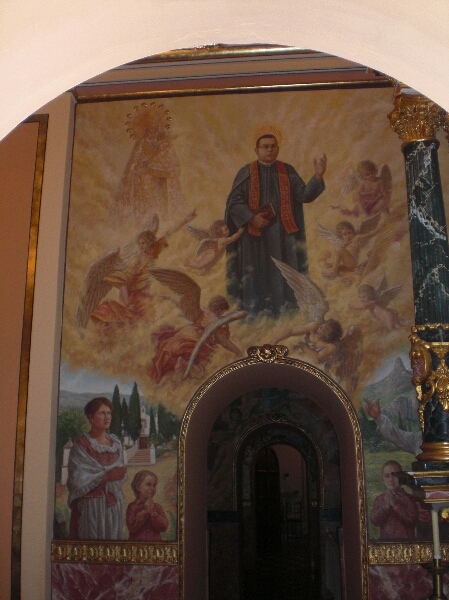 D. Ramón atendiendo a los enfermos, pintura mural de José Antonio Espinar en la Capilla del Beato, parroquia de San Bartolomé de Vallada. El título de Espinar para el otro mural es Apoteosis de D. Ramón (bajo estas líneas).