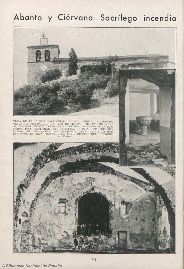 Vista de la iglesia parroquial de San Pedro de Abanto, cerca de Bilbao, que ha sido destruida por un incendio, al parecer intencionado, calculándose las pérdidas en 90.000 duros.- Pila bautismal de la citada iglesia, que fue respetada por las llamas.- Estado en que quedaron el altar mayor y la nave, después del incendio.